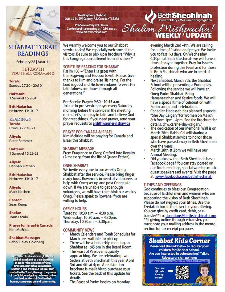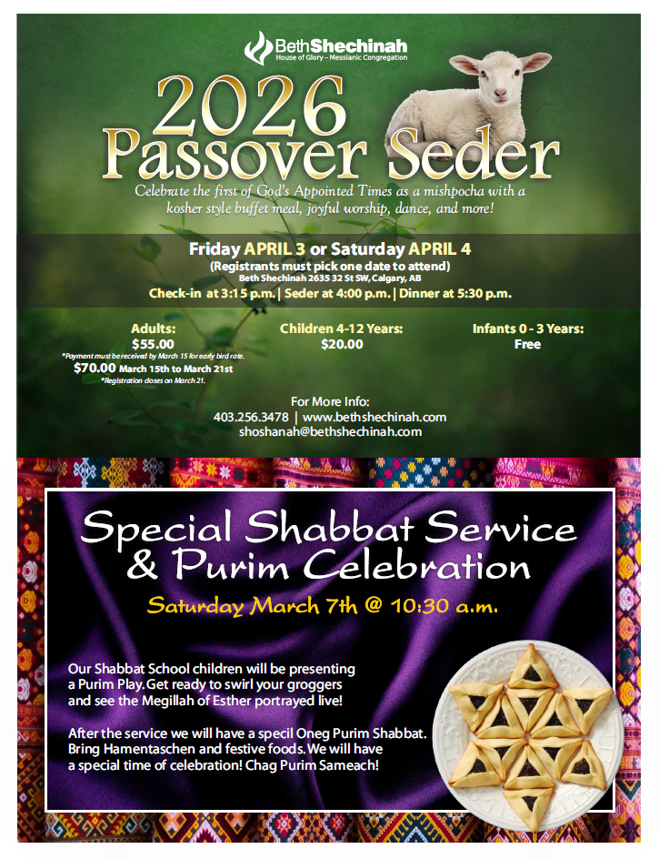 Please remember to pray for Israel this coming week as the eve of Purim begins on Monday evening, March 2nd. Our congregation is calling a time of fasting and prayer during these days and we would invite you to join us in prayer. We will be meeting on Wednesday evening 6:30pm at Beth Shechinah to pray at the conclusion of this Feast. On March 7th our Shabbat school ministry will be presenting a Purim play followed by a festive Oneg lunch after the service. A month after the Feast of Purim we will be celebrating Passover, the season of our freedom. I am including a brochure for you to register for our annual Passover Seder the first of Gods Appointed Times.