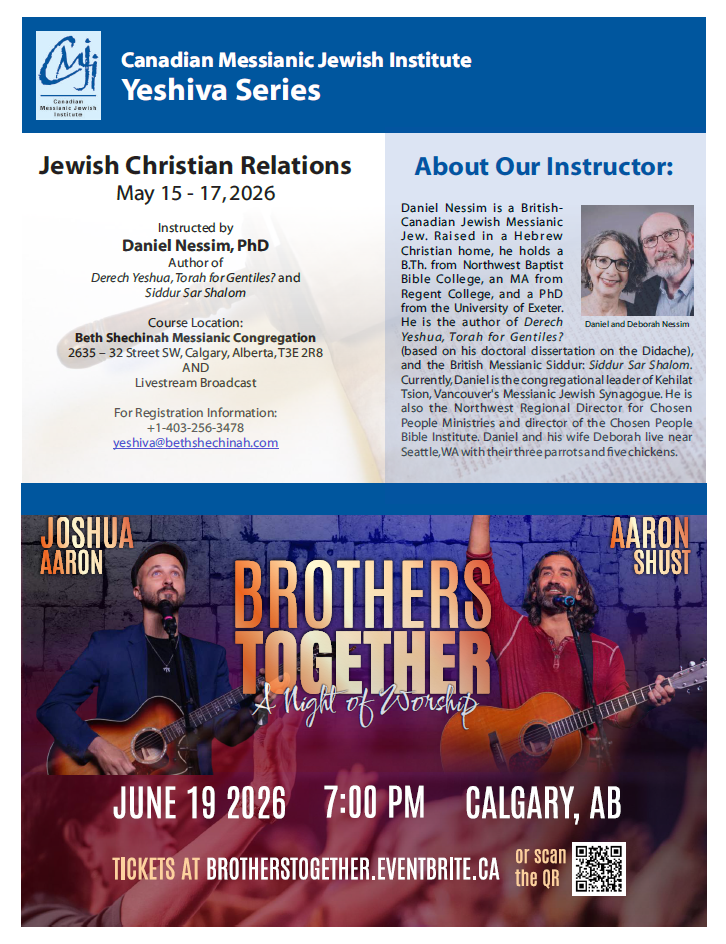 We will be having the Upcoming Spring Yeshiva May 15-17, 2026. Daniel Nessim will be teaching a course on Jewish Christian Relations. Please click the link below for the registration brochure and more details.
